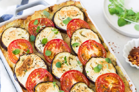 В средно голяма тава за печене наредете на дъното един слой от половината изпечени шайби тиквички и патладжан, като леко ги застъпвате. Отгоре сложете половината от картофеното пюре, като го разнесете равномерно, последвано от половината доматен сос. Повторете с още един слой шайби патладжан и тиквички, последвани от останалия доматения сос, и завършете с остатъка от картофеното пюре отгоре. Подредете отгоре останалите сурови шайби патладжан и резените домати. Печете за 30-35 минути докато леко покафенее отгоре. Охладете за 10 до 15 минути, преди да нарежете на порции.