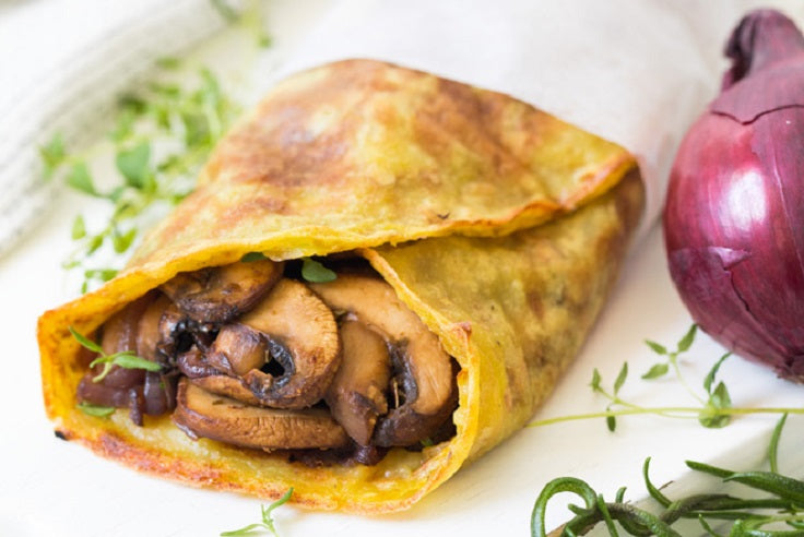 Mushroom lovers will appreciate this recipe, which allows the main ingredient to shine. Sautéed mushrooms, onions, spices and herbs are enclosed in a potato tortilla. Enjoy this recipe with a knife and fork, or grab it in your hand and eat it like a burrito.